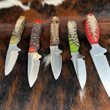 The handle materials include numerous woods from around the world such as Purple Heart, Bloodwood, Ebony, Padauk and Coffee Wood. I stabilize and dye all handle materials as needed. The current inventory includes nearly fifty different varieties of wood. I also collect deer and elk sheds for use, as well as unique materials such as Cholla cactus and pinecones.